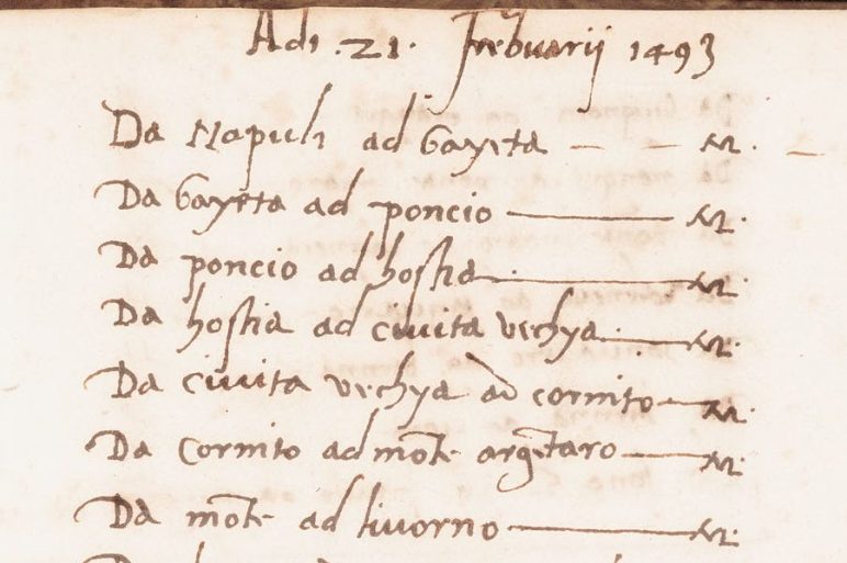 Written in Humanistic cursive by a single hand during the last decade of the fifteenth century, Kenneth Spencer Research Library MS B21 contains a travel itinerary from Italy to France and back.
