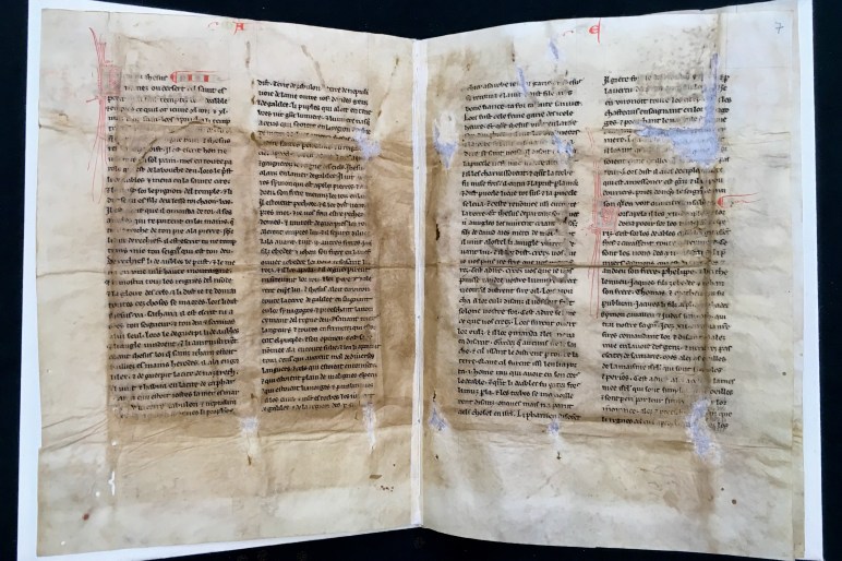 Kenneth Spencer Research Library MS D40 consists of two gatherings that contain parts of the Gospel of Matthew in French.