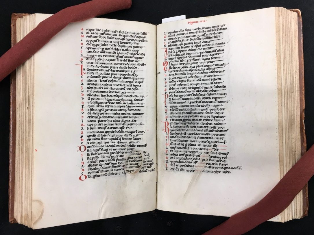 MS C195 contains a copy of Petrus Riga’s Aurora, a verse commentary on the Bible. Also known as Peter Riga (approximately 1140–1209), Petrus was a canon of the Cathedral of Notre Dame of Reims and later a Canon Regular of the Order of St Augustine at St Denis, also in Reims, France. It is thought that the Aurora was written over a long period of time at the end of the twelfth century, between 1170 and 1200. The modern editor of the Aurora, Paul E. Beichner, argues that there were three different editions of the work, all by Petrus Riga, over this thirty-year period as well as two later redactions by Petrus’s disciple, Aegidius of Paris (also known as Egidius or Gilles de Paris, approximately 1160–1223/1224). The text as it is contained in MS C195 is a copy of the third edition of the Aurora except that the beginning is missing and it does not include the chapter titled “Recapitulationes.”