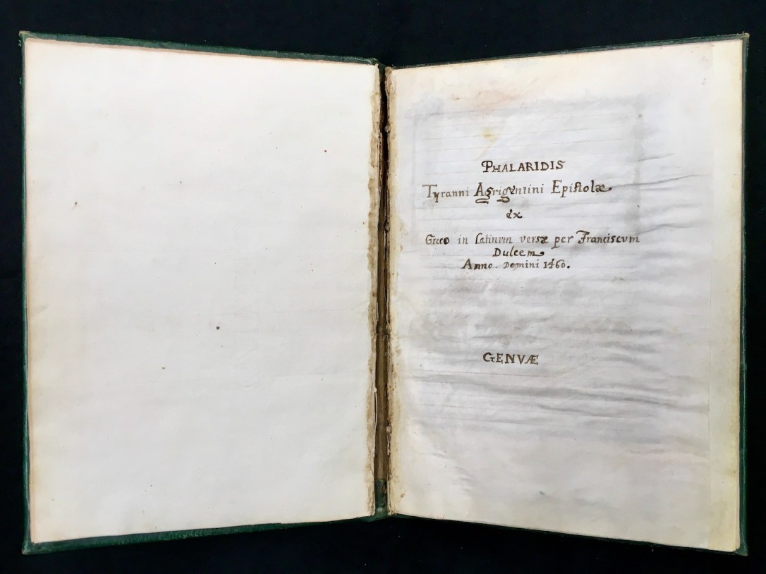 The translation of the Epistles of Phalaris by Francesco Griffolini of Arezzo was the first translation of this work in Greek into Latin and is believed to be dated to the 1440s. The fifteenth century saw a great revival of the ancient and classical literature, especially in Italy, and a surge in translations from Greek into Latin. It is also known that Francesco Griffolini later produced a prose translation of Homer’s Odyssey in Latin at the request of Pope Pius II, as well as translations of the homilies of John Chrysostom among others.
