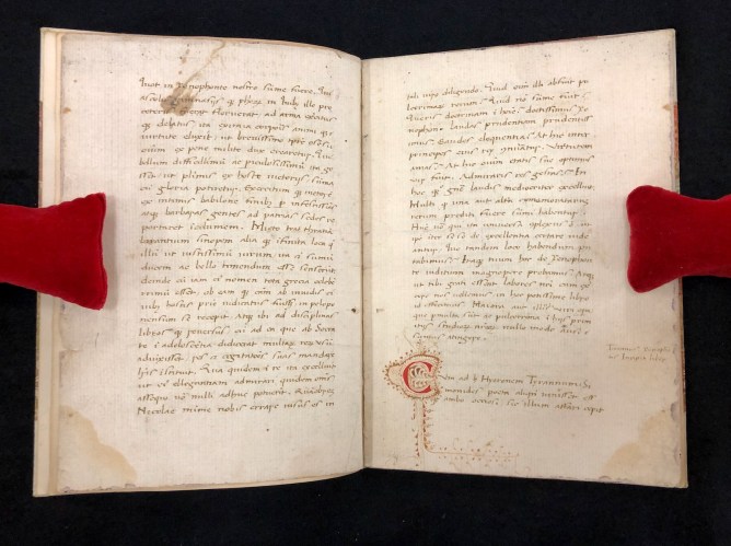 According to our records, it has been some years since any researcher looked at Kenneth Spencer Research Library, MS C68, a paper manuscript of 16 leaves arranged in a single quire. MS C68 contains a single text, a translation into Latin of a work in Greek called the Hiero by Xenophon. Xenophon (c. 431 BCE–354 BCE) was an ancient Greek historian and the Hiero is significant as being his first work to be translated into Latin as far as we know. This translation into Latin by Leonardo Bruni was completed at the very beginning of the fifteenth century, in May 1403, under the title of the De vita tirannica [‘On the Life of a Tyrant’]. Leonardo Bruni (1370-1444), a renowned Italian humanist, translated several classical works from Greek into Latin including those of Aristotle and Plato as well as other works by Xenophon.