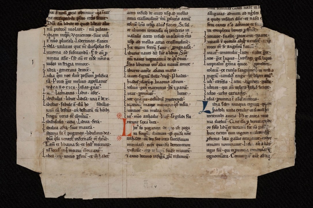 As it stands, 27 lines of text in three columns on both sides of the leaf remain. The three-column layout with ample margins on either side suggests that this fragment was part of a manuscript of substantial size. The widest part of the width of the fragment measures approximately 290 mm. We can therefore estimate that the original manuscript leaf perhaps measured something like 450 x 300 mm. That is to say, this parchment leaf is now perhaps half the size it used to be. A reading of the text immediately reveals that this is some kind of glossary, dictionary or encyclopedia, as it contains an alphabetical list of terms with explanations. The part we have includes terms that begin with the letter L, and that is why there are repeated decorated initial Ls on both sides of the leaf, two of which are pen flourished in red and the other two in plain blue. We can see that not all the terms begin with a decorated initial but only the ones that have relatively lengthier explanations.